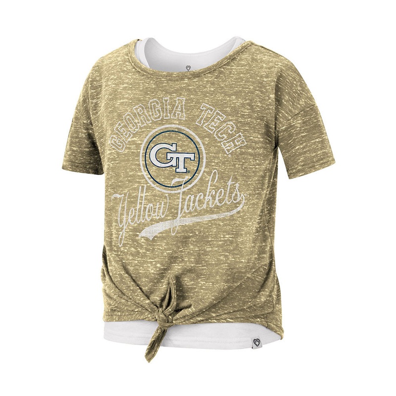 Show off your support in style with this Girls Georgia Tech Yellow Jackets Stroll 2 Layer T-Shirt! Officially Licensed Brand: Colosseum Color: Gold 95% Polyester, 5% Cotton Attached inner tank top Tie front Distressed screen print graphic
