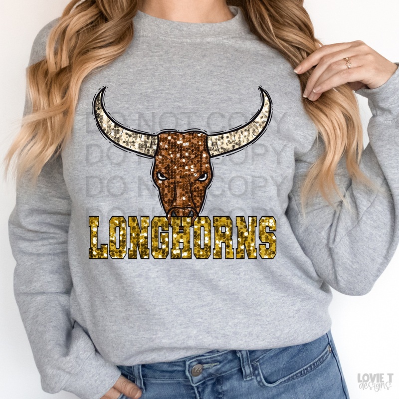 Gold Longhorns Sequin|Pocket 3.5″-4″|Infant|Toddler|Youth 8.5|Adult 11″|Adult 12″