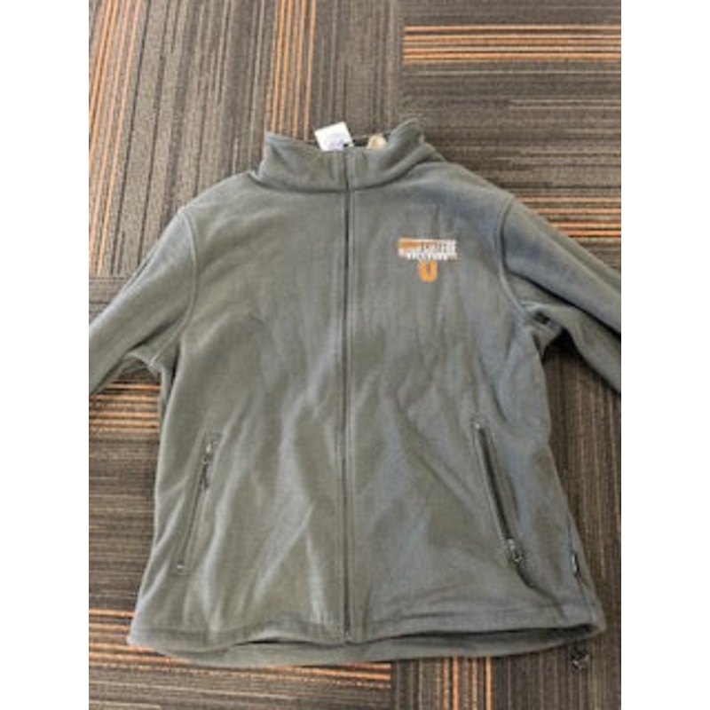Gray fleece jacket with full zip on front. Union College logo in white and orange.