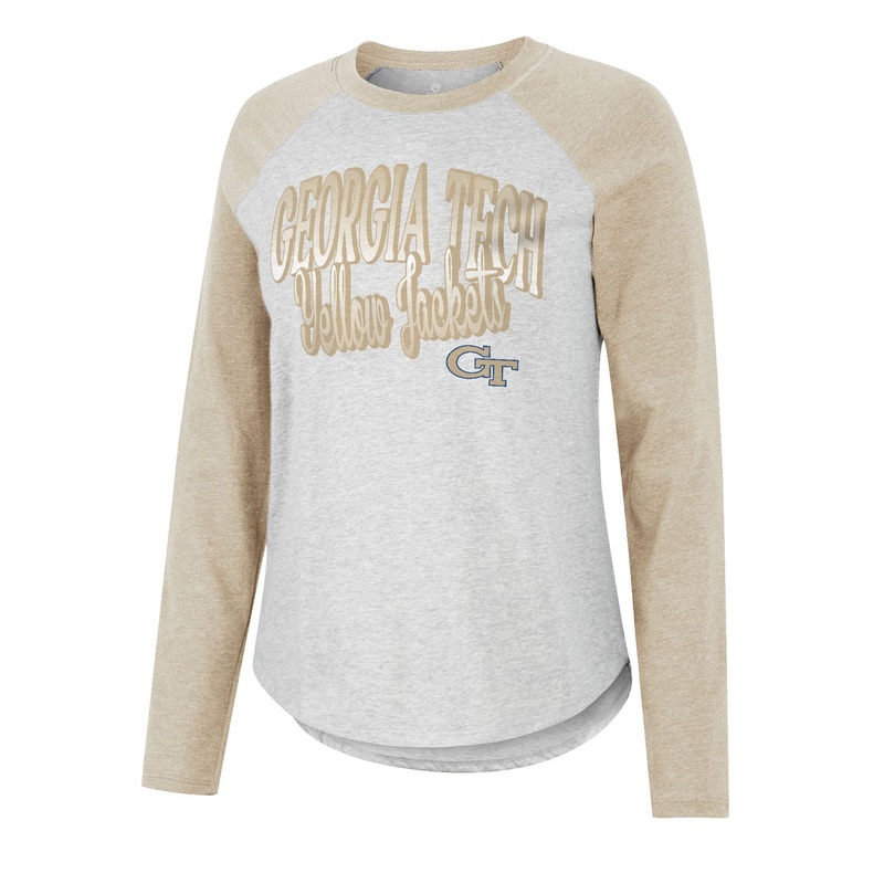 Show off your team spirit in this Ladies Georgia Tech Yellow Jackets Carol Long Sleeve Grey T-Shirt! Officially Licensed Brand: Colosseum Color: Grey 52% Cotton, 48% Polyester Raglan-cut sleeves Rounded hem Screen print graphic