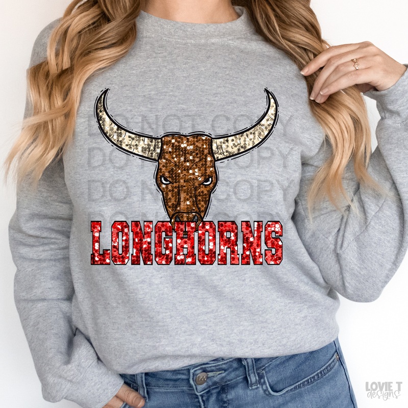 Longhorns Red Sequin|Pocket 3.5″-4″|Infant|Toddler|Youth 8.5|Adult 11″|Adult 12″