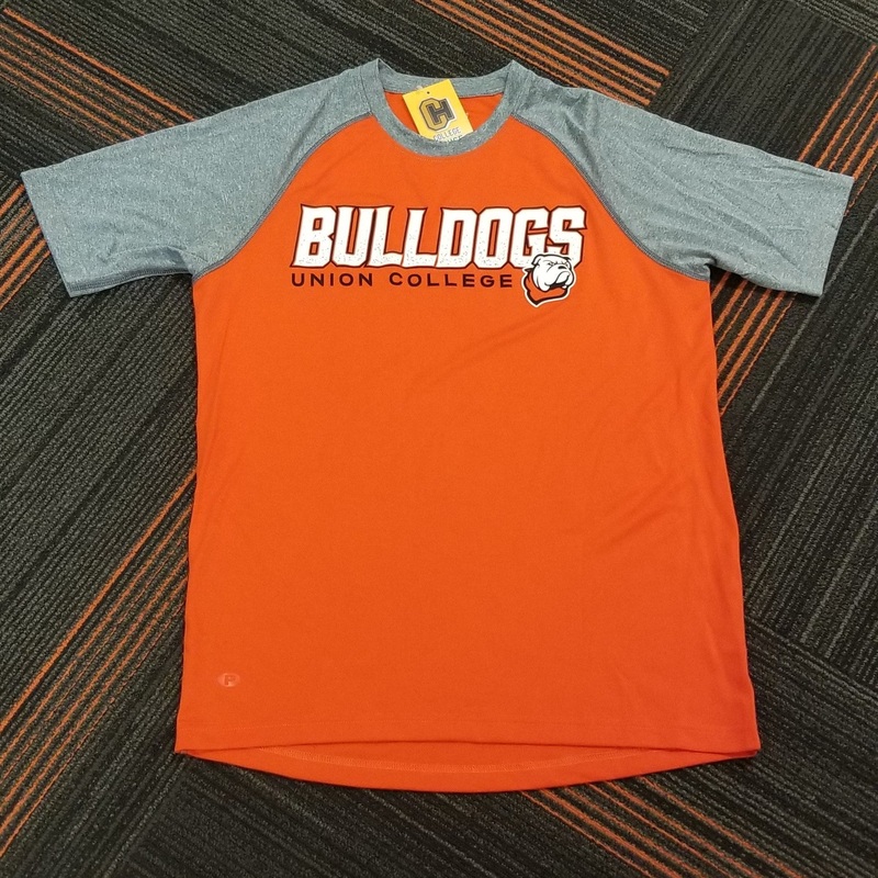 Color: Orange and Carbon Heather block Wording: Bulldogs in white Union College in Black with Bulldog head Logo 100% Polyester