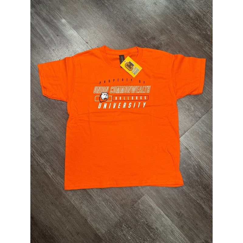 orange tee with "property of union commonwealth university" and a bulldog logo and "bulldogs" in rectangles in the middle