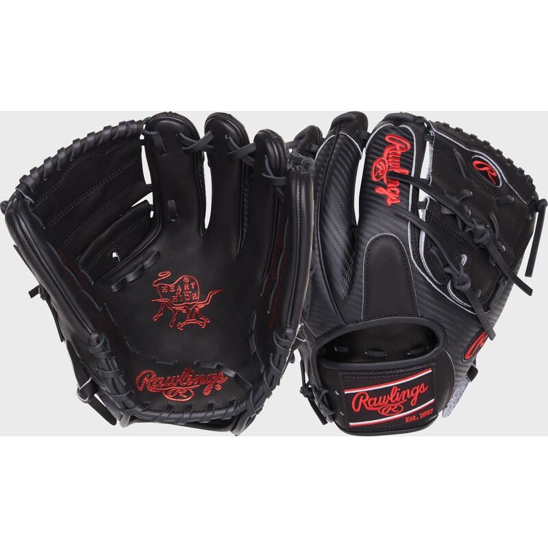 Feel fluid and in control with this luxurious 11.75-inch Heart of the Hide black hypershell infield glove. The all-black look becomes elevated with the black hypershell design, creating a lightweight feel and a premier look while on the field. The added red featurtes on the Rawlings patch and stamp tie in for a more coehsive look.