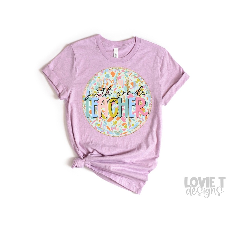 TERRAZZO SIXTH GRADE TEACHER|Pocket 3.5″-4″|Infant|Toddler|Youth 8.5|Adult 11″|Adult 12″