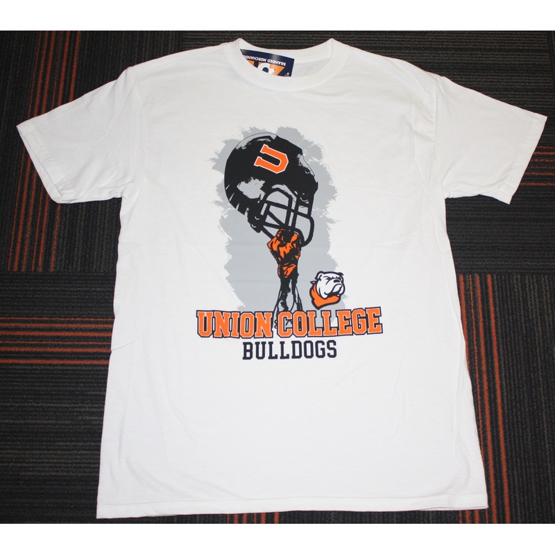 Color: White Black Helmet with orange U Logo Hand/Palm Holding the helmet with small bulldog head Logo Union College in Orange Lettering Bulldogs in Black Lettering